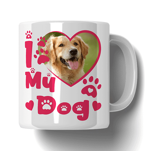 Kubek ze zdjęciem I Love My Dog Serce. Kubek z Twoim Pupilem. Stwórz Kubek z personalizacją. Dodaj zdjęcie i imię swojego zwierzaka. Idealny dla miłośników zwierząt.